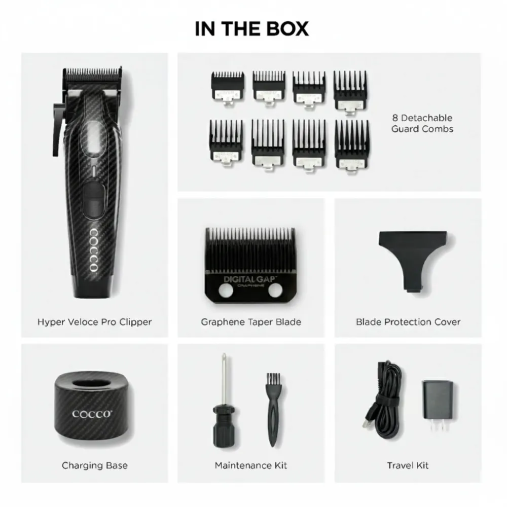 The Cocco Hyper Veloce Pro Clipper in Carbon Fiber is a premium professional tool built for barbers and stylists who demand high-performance cutting with a refined, standout finish. Combining advanced graphene blade technology, powerful motor performance, and a sleek carbon fibre design, this clipper delivers precision, durability, and all-day reliability.
