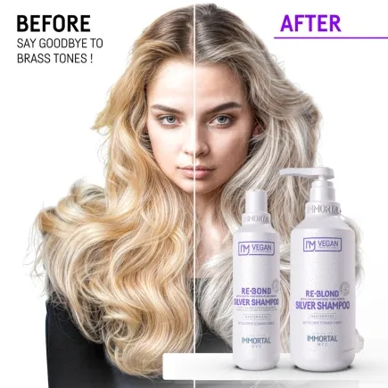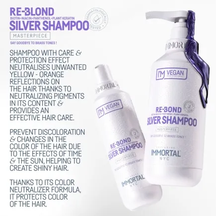Bring brilliance back to your blond or gray hair with Immortal VEGAN Re-Blond Silver Shampoo. This gentle yet powerful formula is enriched with biotin, niacin, panthenol, and plant-based keratin to tone down brassiness, deeply nourish, and restore strength to lightened strands.