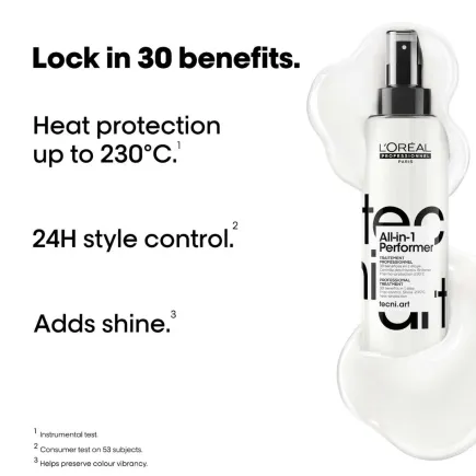 L'Oréal Professionnel TecniArt All-In-One Performer is a pro-level leave-in spray that packs 30 benefits into one bottle. It protects, conditions, smooths, strengthens, and keeps hair looking sharp whether you're cutting, styling, or finishing.