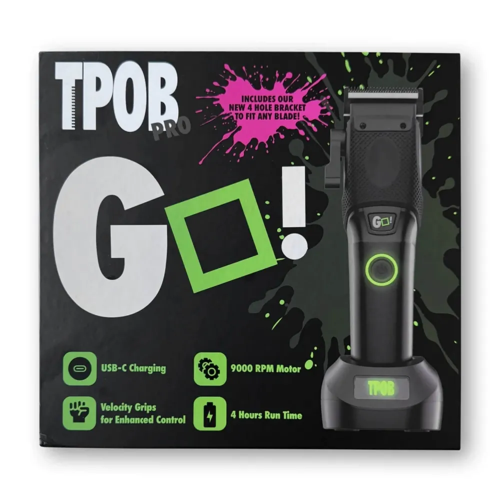 The TPOB Go Clipper (Blackout Edition) is a high-performance professional clipper designed for power, precision, and durability. Equipped with the GO! TORQ Digital Motor delivering 7000–9000 RPM, this clipper provides exceptional torque for effortless cutting through bulk and coarse hair. The sleek blackout design combined with advanced ergonomics ensures comfort, control, and reliable performance for busy barbers.