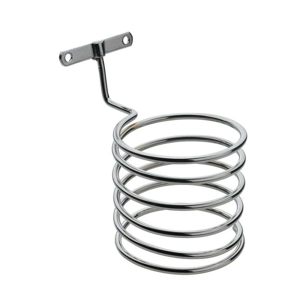 The Ultron Spiral Hair Dryer Holder is a durable, wall-mounted accessory designed for professional salons and barbers. Its sleek chrome finish and spiral metal design securely hold your hair dryer while keeping your workspace organized and stylish.