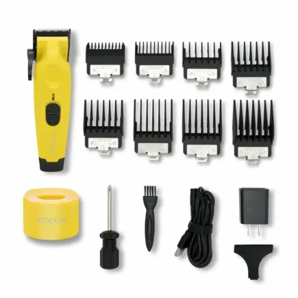 Elevate your cutting game with the COCCO HYPER VELOCE PRO CLIPPER. At the heart of this tool is our improved world-class brushless DC motor that ensures unmatched power and a silent operation, making it a staple for professionals. The clipper boasts a state-of-the-art Digital Gap™ Graphene Taper Blade which not only provides natural lubrication but also guarantees that the blade stays sharper and cooler for extended periods. Never compromise on precision – with 5 adjustable blade levels and 8 detachable guards, achieving the perfect length and style has never been easier. Encased in a durable all-metal aluminum alloy housing, this clipper promises durability without compromising on weight, ensuring effortless handling. Furthermore, its unique design offers enhanced visibility for precision cuts. The quick charging lithium-ion battery ensures that you're always ready to go, and with the intuitive blue light charging indicator, you're always in the know. Each clipper comes with a specially designed base charging station, and as a limited edition release, it’s available in four vibrant colors - Dark Teal, Orange, Yellow, and Green. Experience the fusion of design, technology, and performance with the COCCO HYPER VELOCE PRO CLIPPER.
