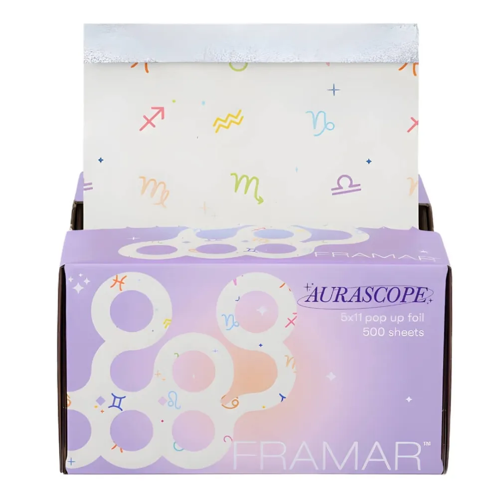 The Framar Aurascope Pop Up Foil features 500 pre-cut, pre-folded embossed foil sheets designed for fast, efficient balayage and highlighting services. Measuring 5x11 inches, these professional hair foils are ready to use straight from the box with no prep required.