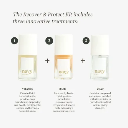 Restore, strengthen, and protect your natural nails with the Navy Recover & Protect Nail Treatment Kit — a complete three-step system developed by professional manicurists to repair damage, improve resilience, and promote healthy nail growth. Each step is expertly formulated to work in harmony, delivering smoother, stronger, and more radiant nails without the need for a gel lamp.