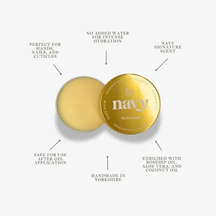 Indulge in the ultimate hand and nail care with the Navy Hand Balm — a luxurious, deeply nourishing treatment handcrafted in North Yorkshire. Formulated with a rich blend of Rosehip Oil, Aloe Vera Extract, and Coconut Oil, this balm promotes nail growth while softening and hydrating even the driest hands and cuticles. Lightly scented with Navy’s signature mandarin and sandalwood fragrance, it delivers a calming, spa-like experience with every use.